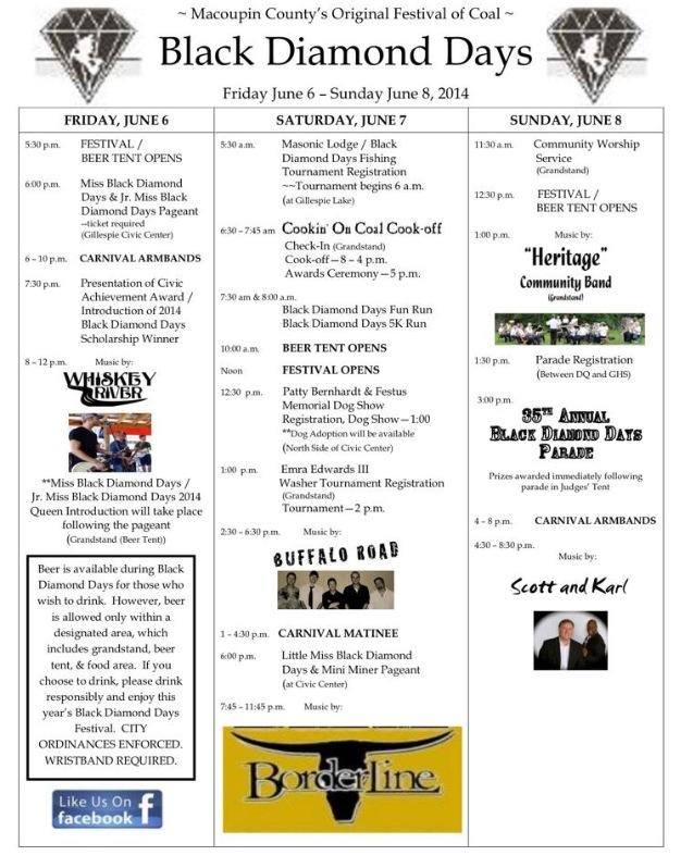 The annual Black Diamond Days festival begins this afternoon at 5:30 p.m. and will continue through 8:30 p.m. on Sunday. The annual three-day festival shuts down Macoupin Street in Gillespie and features popular bands, pageants, tournaments and of course, the carnival.