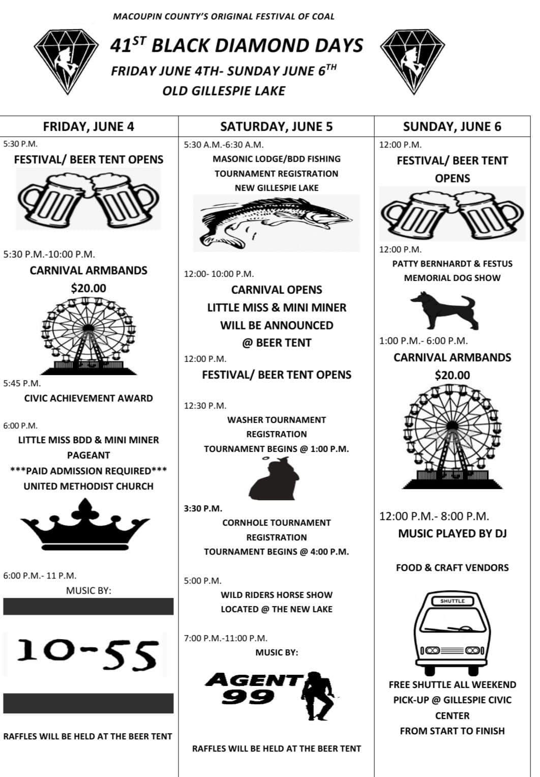 Saturday starts with the Masonic Lodge fishing tournament at the New Gillespie Lake. The carnival will open at noon with the washer tournament starting at 1 p.m. and the cornhole tournament starting at 4 p.m. A horse show will take place at 5 p.m. at the new lake.
