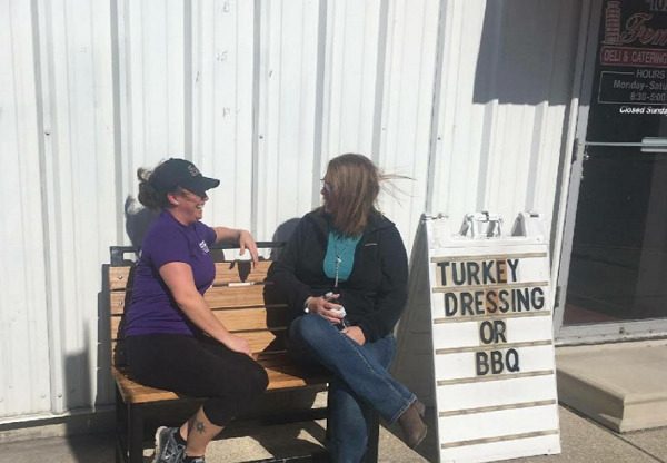 Mandy Manalia, an employee of Fema’s, and Gina Frensko, an employee of the City of Benld, have a conversation while using a new bench that is positioned in front of Fema’s.