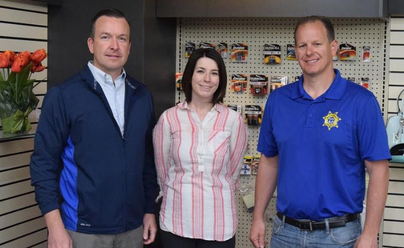 State Senator Andy Manar (D-Bunker Hill) is joined by Tammy Buffington of Sullivan’s Pharmacy and Macoupin County Sheriff Shawn Kahl at Sullivan’s Pharmacy in Staunton on April 29 during the Macoupin County drug takeback event.