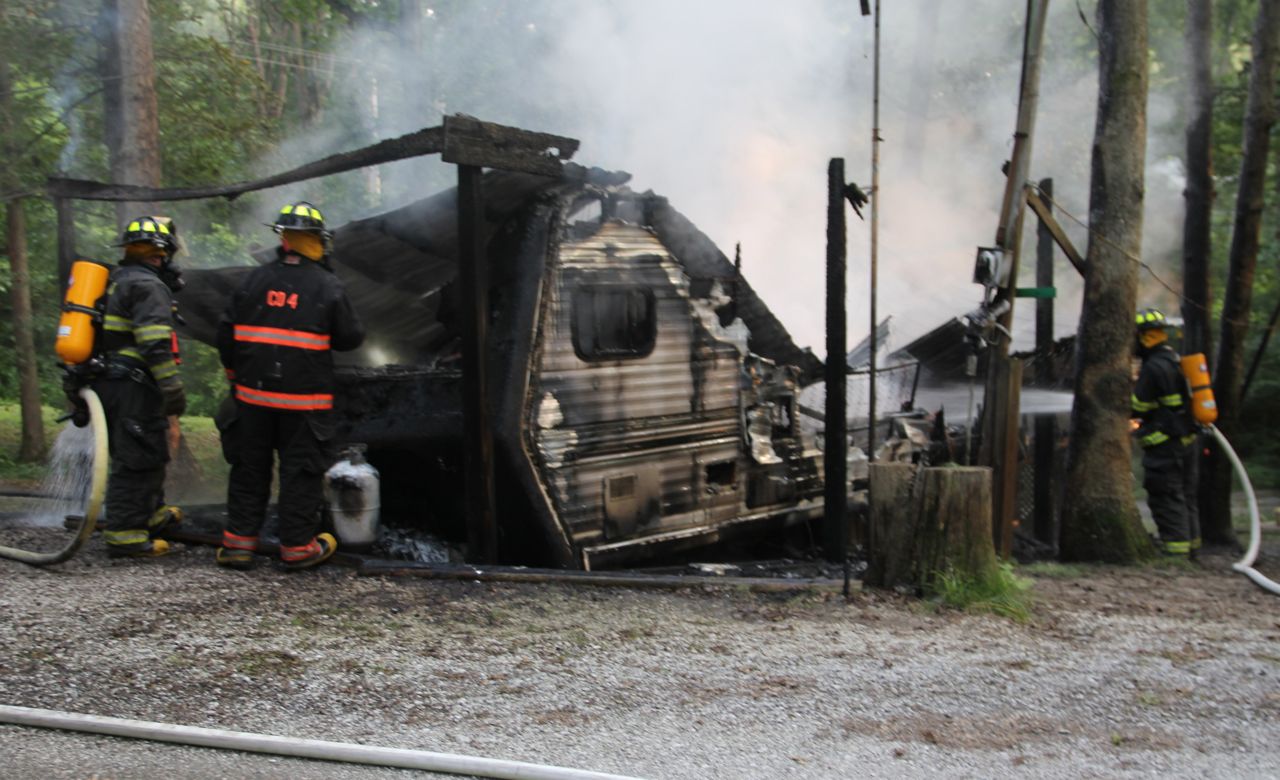 A family’s camper caught fire early Friday evening, July 3, near Gillespie Lake after neighbors noticed smoke coming from the pull-behind travel trailer.