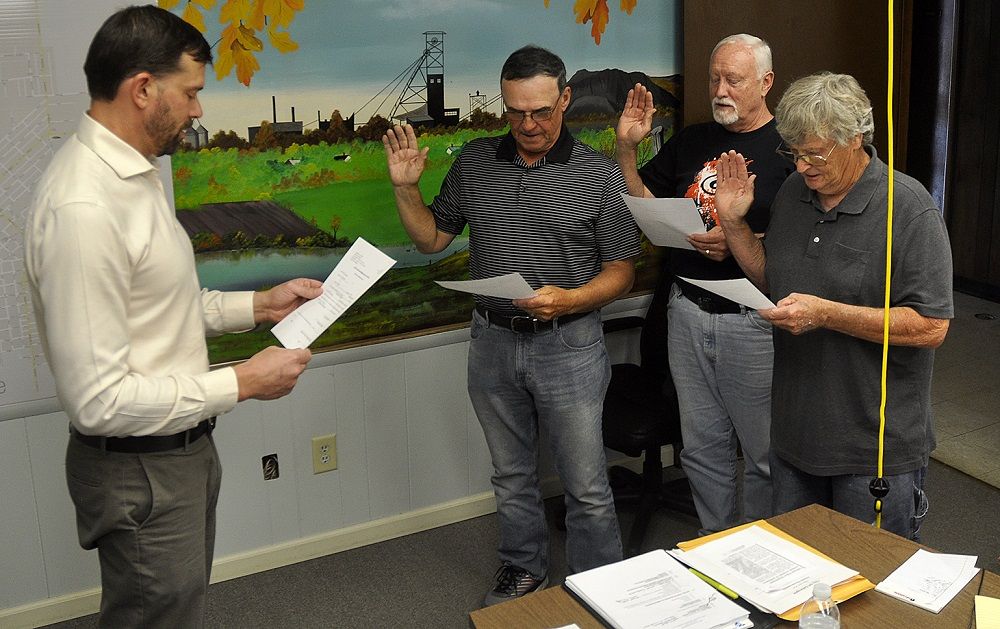 The discussion followed a brief opening session leading up to the swearing in of city officials and aldermen who were re-elected in the April 4 consolidated election. City Attorney Polo administered the oath of office to Mayor John Hicks, City Clerk Frances Smith and City Treasurer Dan Fisher. Aldermen Jerry Dolliger, Frank Barrett and Dave Tucker were sworn in as a group. Diana Brickey, a third ward alderperson appointed in November 2016 after the resignation of Roger Dively, was elected to a two-year unexpired term but did not attend Monday night’s meeting. She reportedly will be sworn in later.