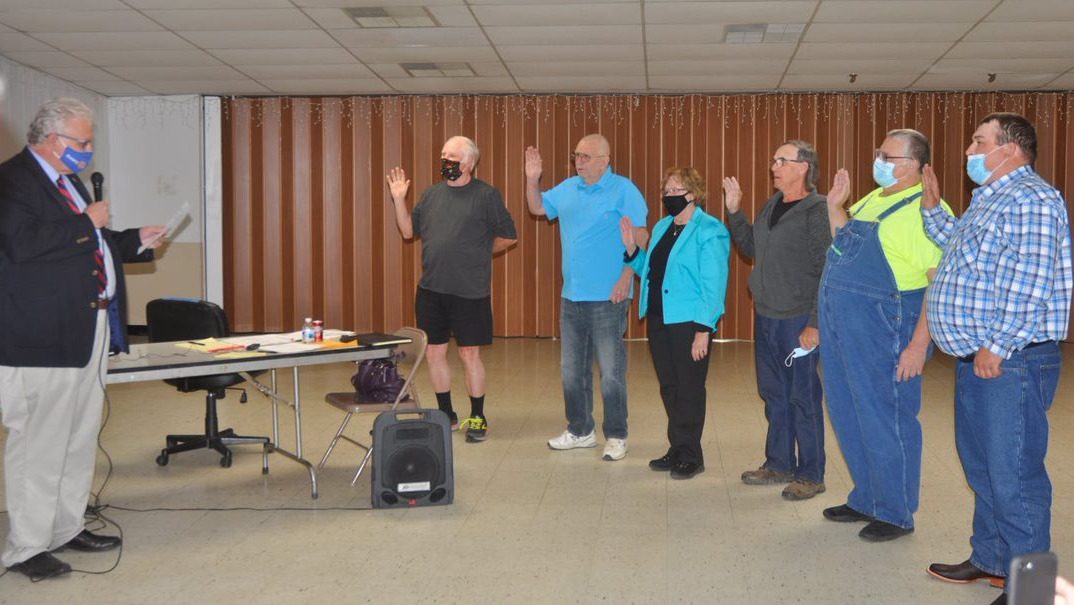 The new council has a decidedly different look. Before moving on to new business, City Attorney Dan O’Brien administered the oath of office to Mayor John Hicks, City Clerk Frances Smith and City Treasurer Dan Fisher, all of whom were re-elected during April’s Consolidated Election. Also sworn-in were Ward 2 Ald. Frank Barrett, who was re-elected in April; Ward 1 Ald. Bob Fritz, who defeated incumbent Jerry Dolliger; and Ward 3 Ald. Landon Pettit, who defeated incumbent Dave Tucker. Bill Hayes, an appointee elected to a two-year unexpired term as Ward 3 Alderman, attended the meeting via telephone and took the oath of office remotely.