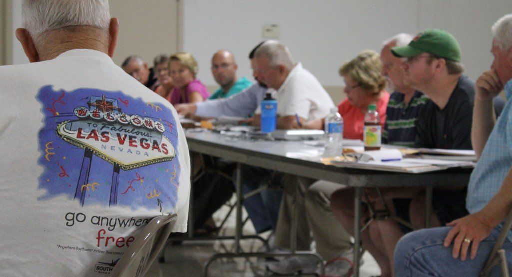 A gentleman from the VFW in support of gambling shows his stance by wearing a Las Vegas, Nevada tee shirt. The council prepares notes in the background.
