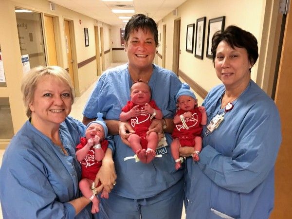Three babies arrived on February 1, 2017 at the hospital. Pictured are Shari Grandidier, RN holding Jeffery David Bone; Sarah Suhrenbrock, RN holding Lillian Joyce Vallelonga; and Elisa Feldmann, RN holding Casey Allen Smith, Jr.