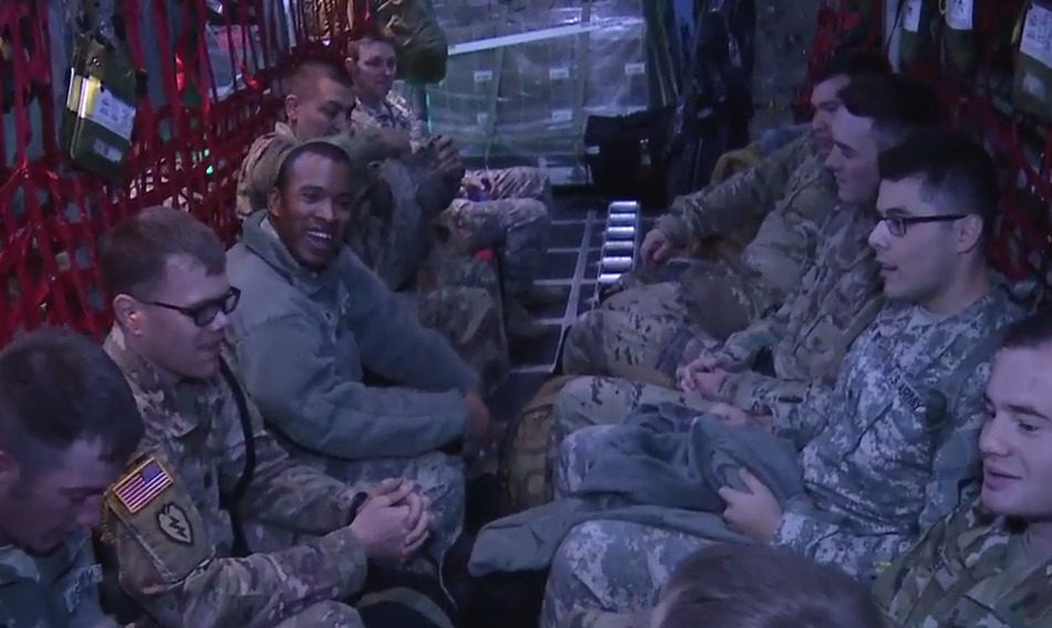 A screenshot from the video of the deployment posted by Illinois Department of Central Management Service’s shows soldiers from the 933rd Military Police Company, based at Fort Sheridan, flying to Puerto Rico.