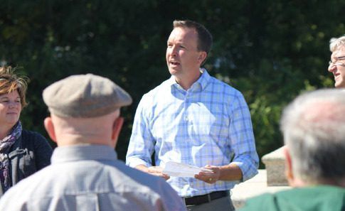 State Senator Andy Manar (center), Amy Rueff (left) and Tim Drea (right) of the AFL-CIO, announce a $43,000 state grant and a $70,000 contribution from the AFL-CIO to help fund the restoration project of the Mother Jones Monument.
