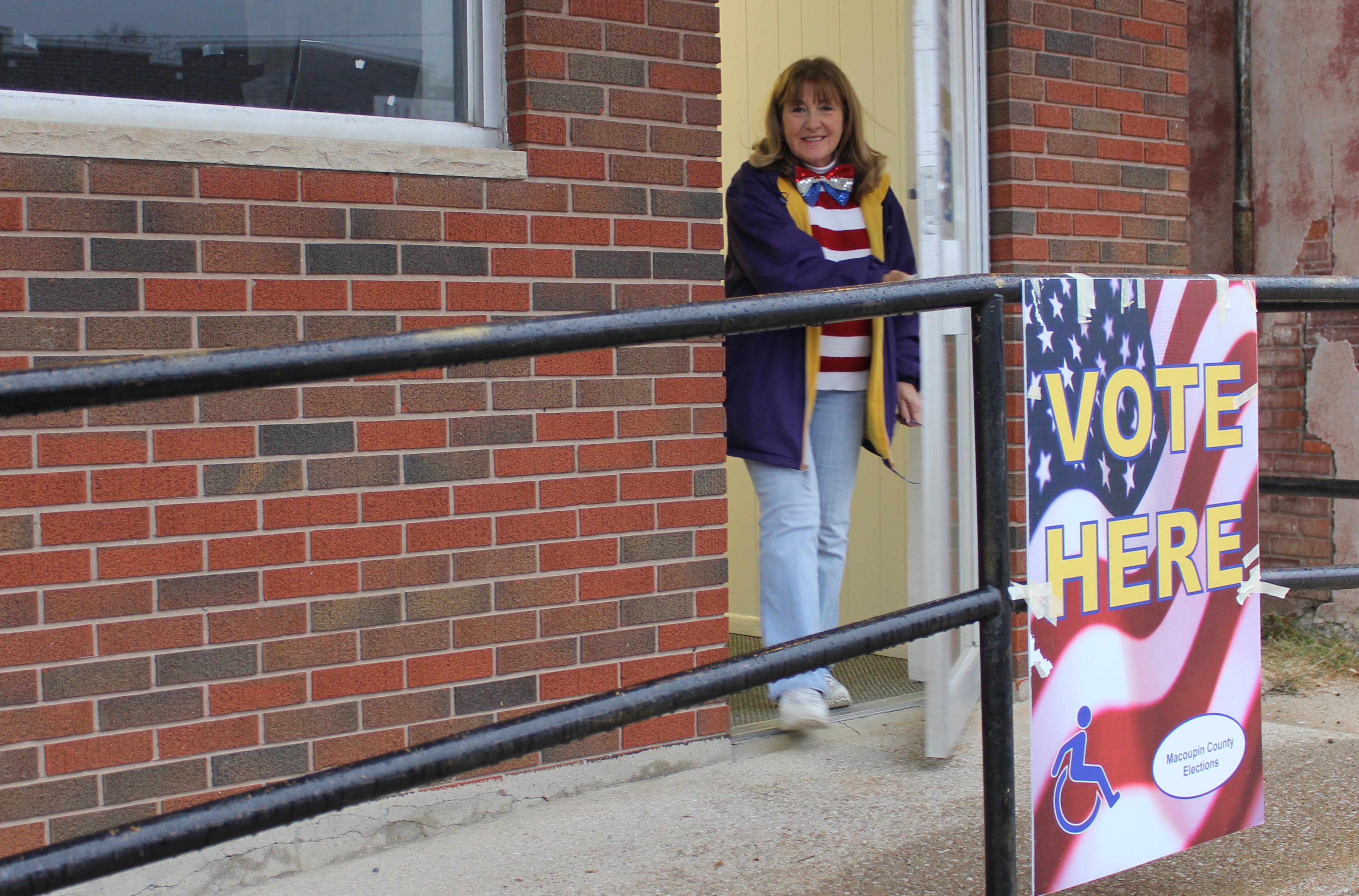 Nancy Ribes strolls out of the polls yesterday afternoon in Benld.