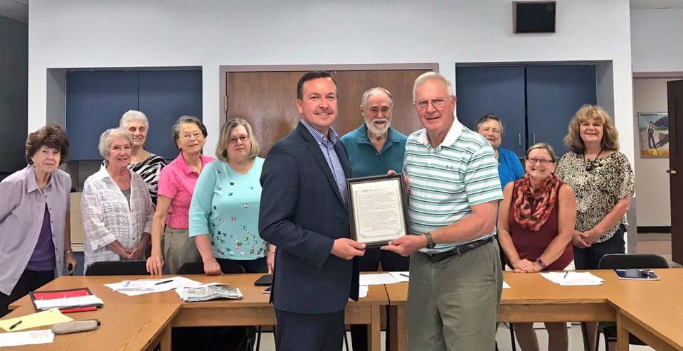 State Senator Andy Manar (D-Bunker Hill) is presented with a certificate of appreciation by members of the Macoupin County Retired Teachers Association during its meeting Oct. 3, 2018, in Carlinville.