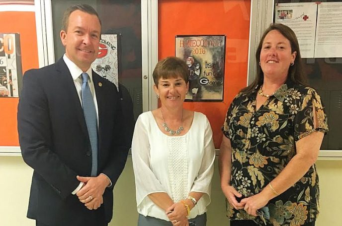 Senator Andy Manar with principals Jill Rosentreter and Lori Emmons.