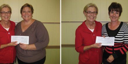 Judy Cordum, secretary of The Partnership, presents a check to BGES principal Angela Turcol for $9,488.72, representing 21 grants and GMS principal Jill Rosentreter to cover 13 grants totaling $6,231.72.