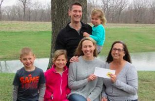 Sally Prevedell Seraphin receives her family’s raffle winnings from Partnership secretary, Rosie Emmenderfer. (Front from left to right): Augie, Norah, and Sally Seraphin with Rosie Emmenderfer. In back, Pete Seraphin holding Eve.