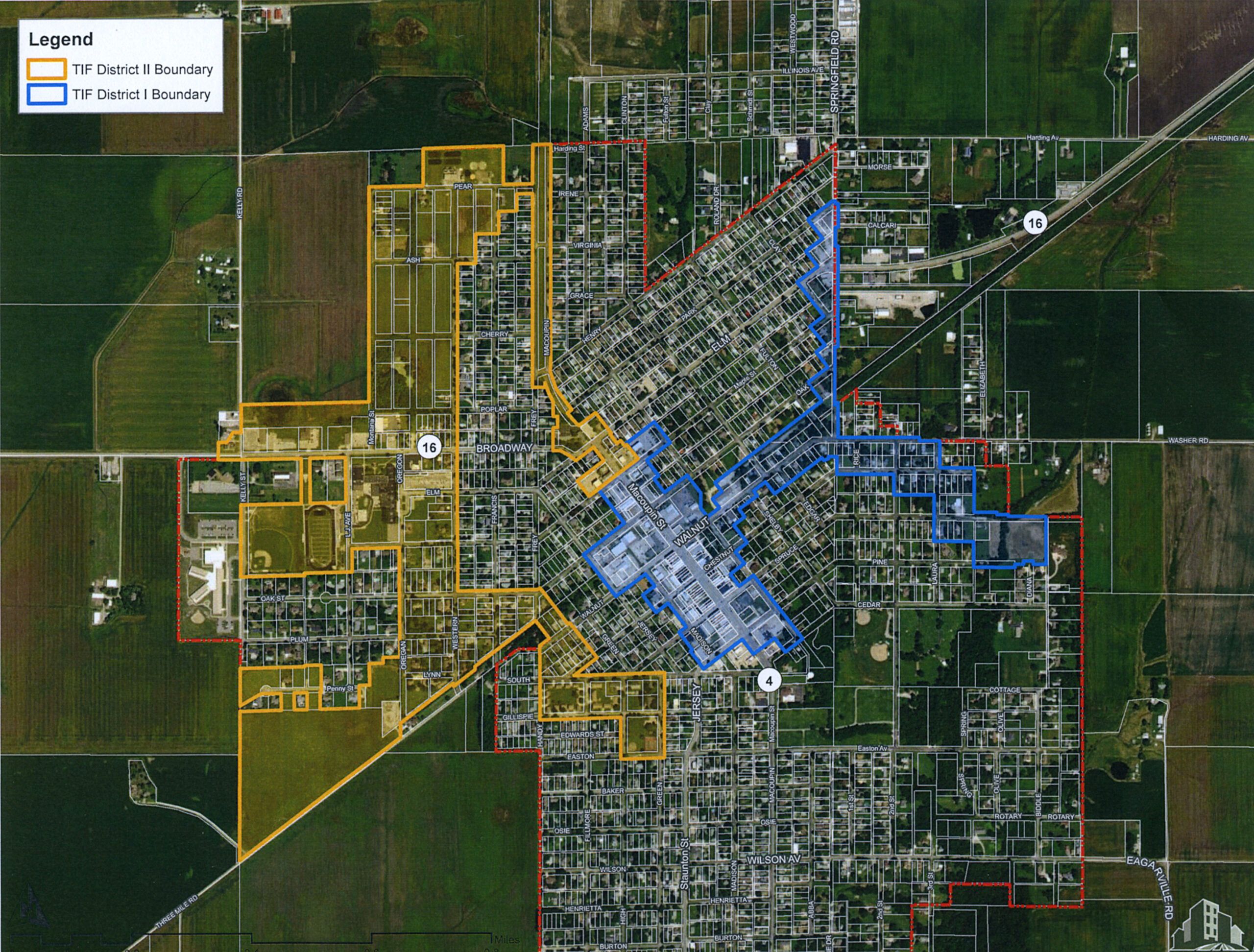 The proposed new district—TIF District II—will encompass much of the city’s underdeveloped west side, including substantial tracts of platted lots that have never been developed. Because the district must be contiguous, the new district will use the old Illinois Terminal Railway right-of-way to reach Macoupin Street at Maple Street and join with the northwest boundary of TIF District I. At the south end of the proposed district, the boundaries snake through a residential neighborhood to take in Big Brick Park. Including the park within the district may enable the park to take advantage of TIF funds for improvements once the district starts to generate revenue.