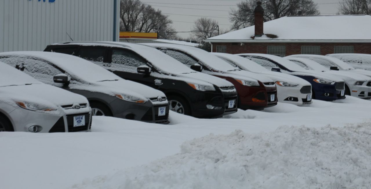 The new inventory at the Drew Ford dealership in Gillespie is blanketed in snowfall while drifts were as tall as some of the tires on the vehicles.