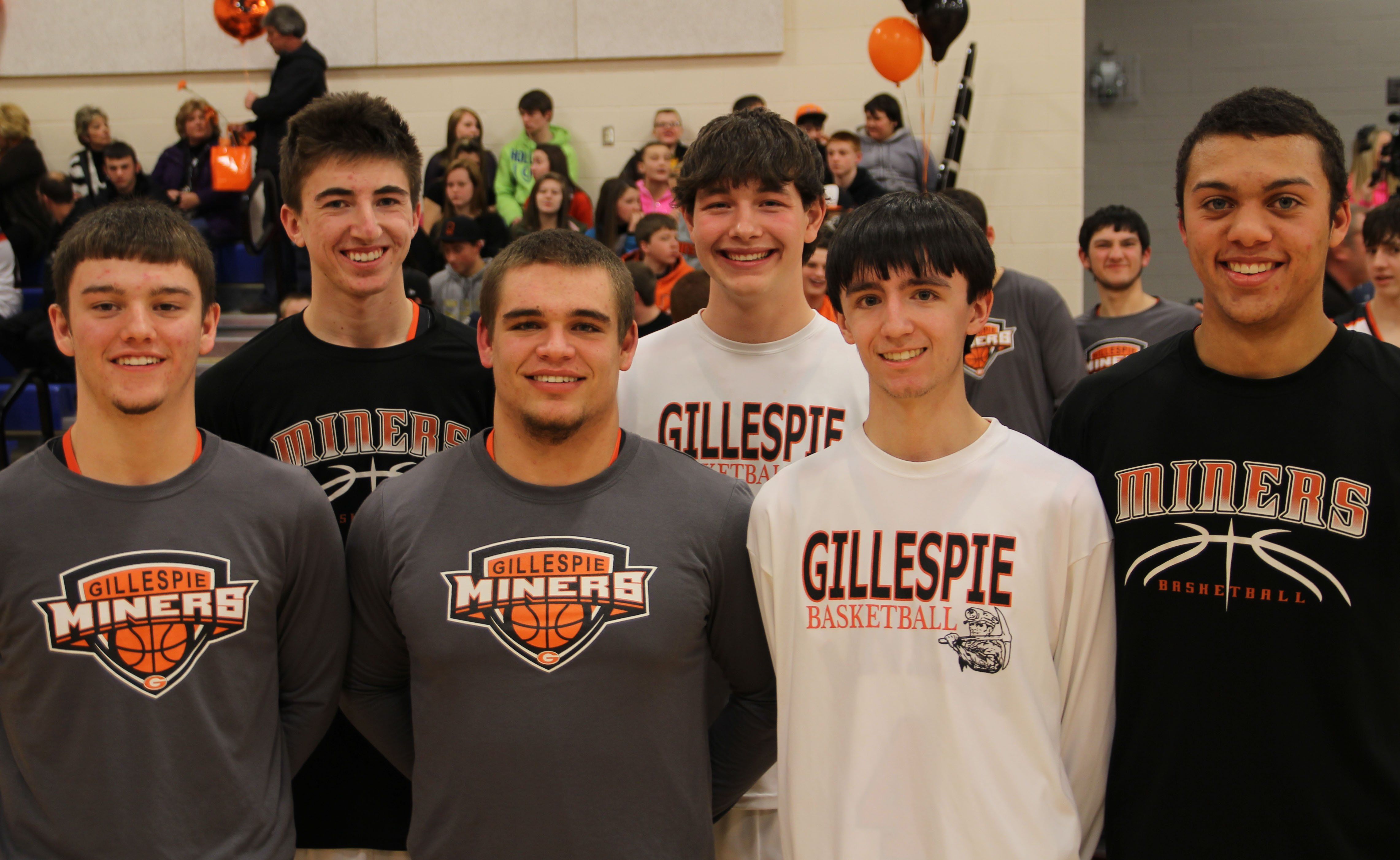The Gillespie High School boys' basketball team celebrated senior night last week. Five seniors will leave the team: (L-R): Blake Peterson, Jake Fredericks, Derrick Tiburzi, Billy Werner, Austin Lytle, and Chris Halpin.