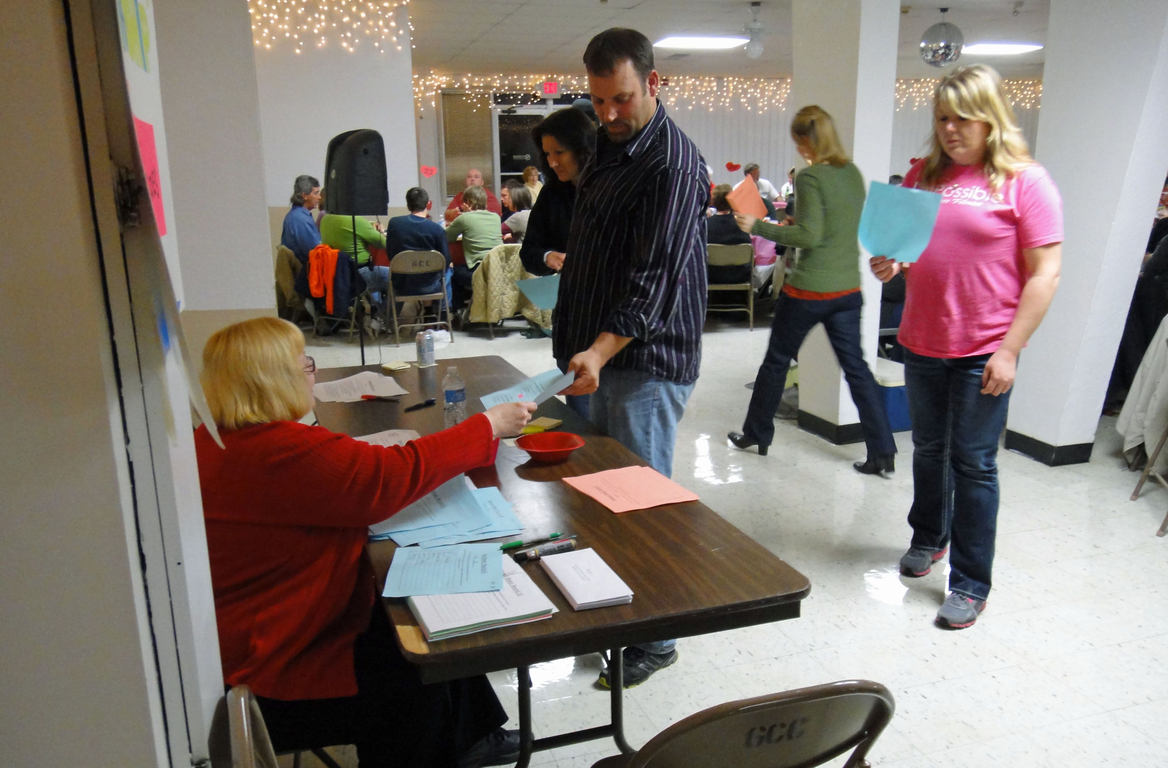 Todd Libbra hands in his answer sheet at the Partnership of Educational Excellence Trivia Night while Erin Davis looks over her answers one last time.