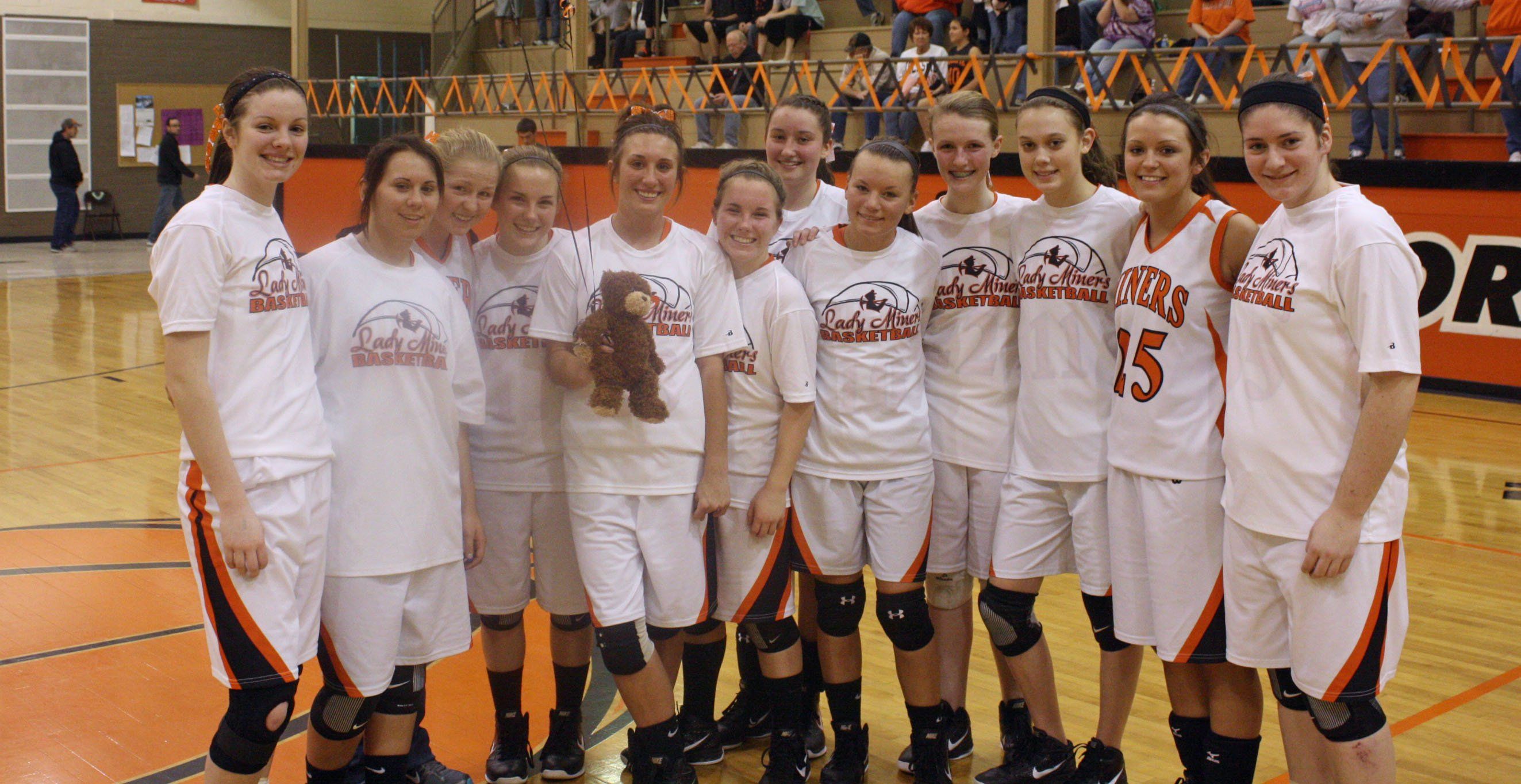 The girls basketball team poses for a picture with their one senior, Loni Nicole Manalia, before the game Thursday evening.