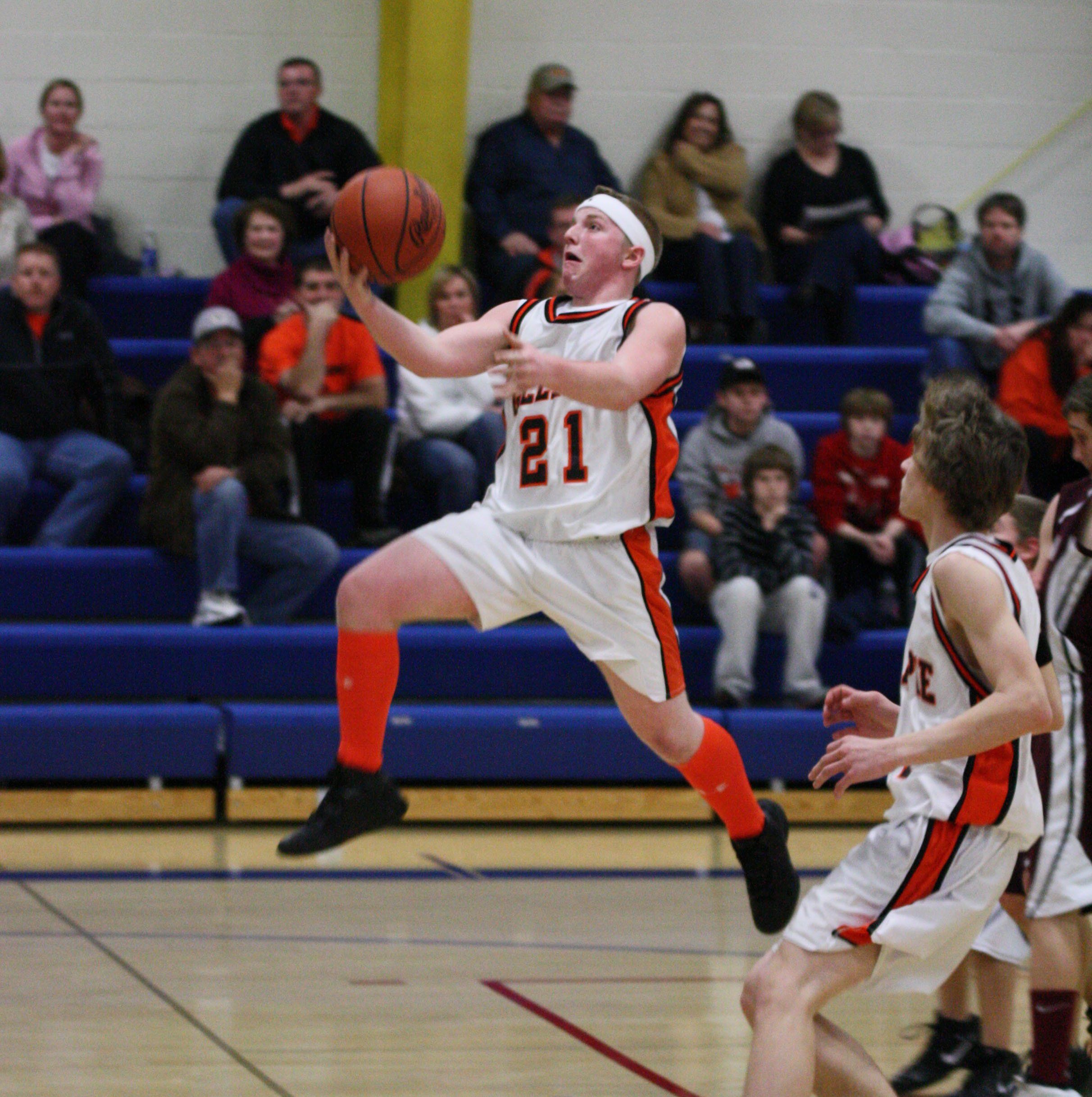 Eli Fox flies through the air and lays it in the hoop for two points. The 8th grade team later won their regional and will play Wednesday in Sectionals.