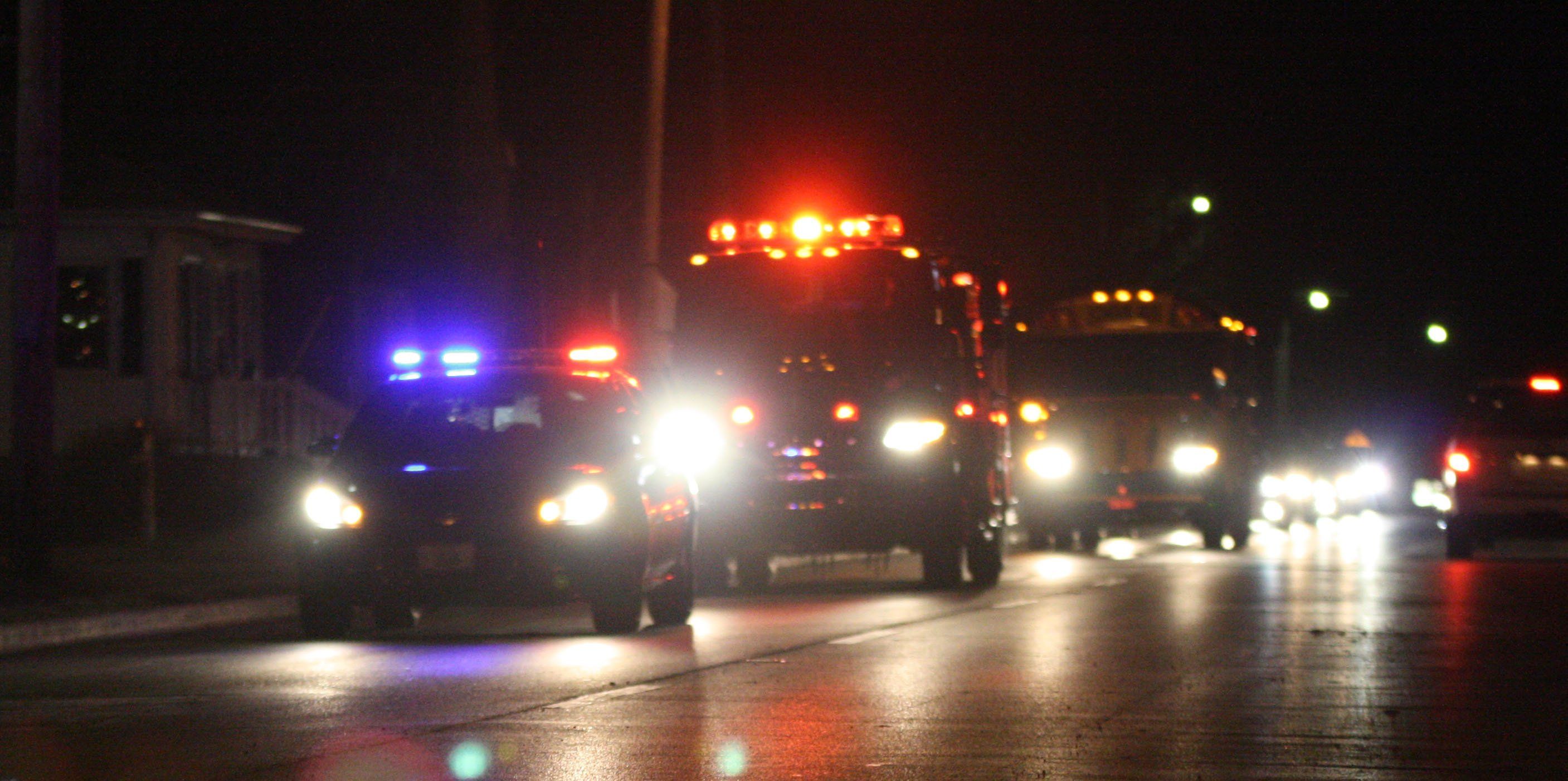 A police car and fire engine escort the 8th grade team into town Thursday evening after they won their class 3A regional.