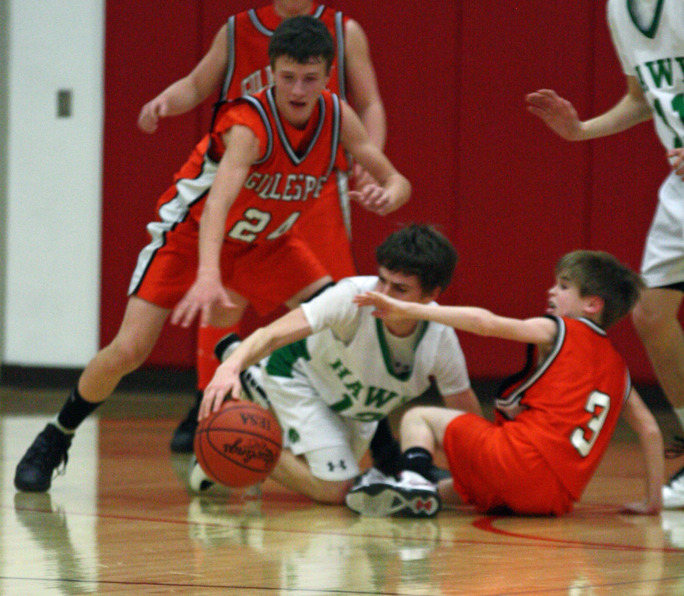 Evan Price and Colin Tieman fight for a ball in their sectional game Wednesday evening. The boys fell by just one point.