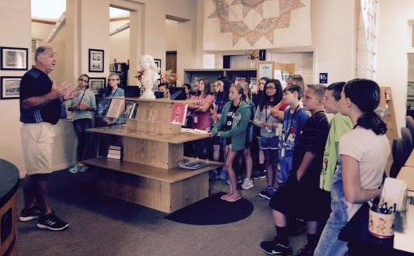 Sixth grade students of Gillespie Middle School toured the Gillespie Library last week and met with the librarian, Steve Joyce (furthest left). (Photo by Gillespie CUSD #7)