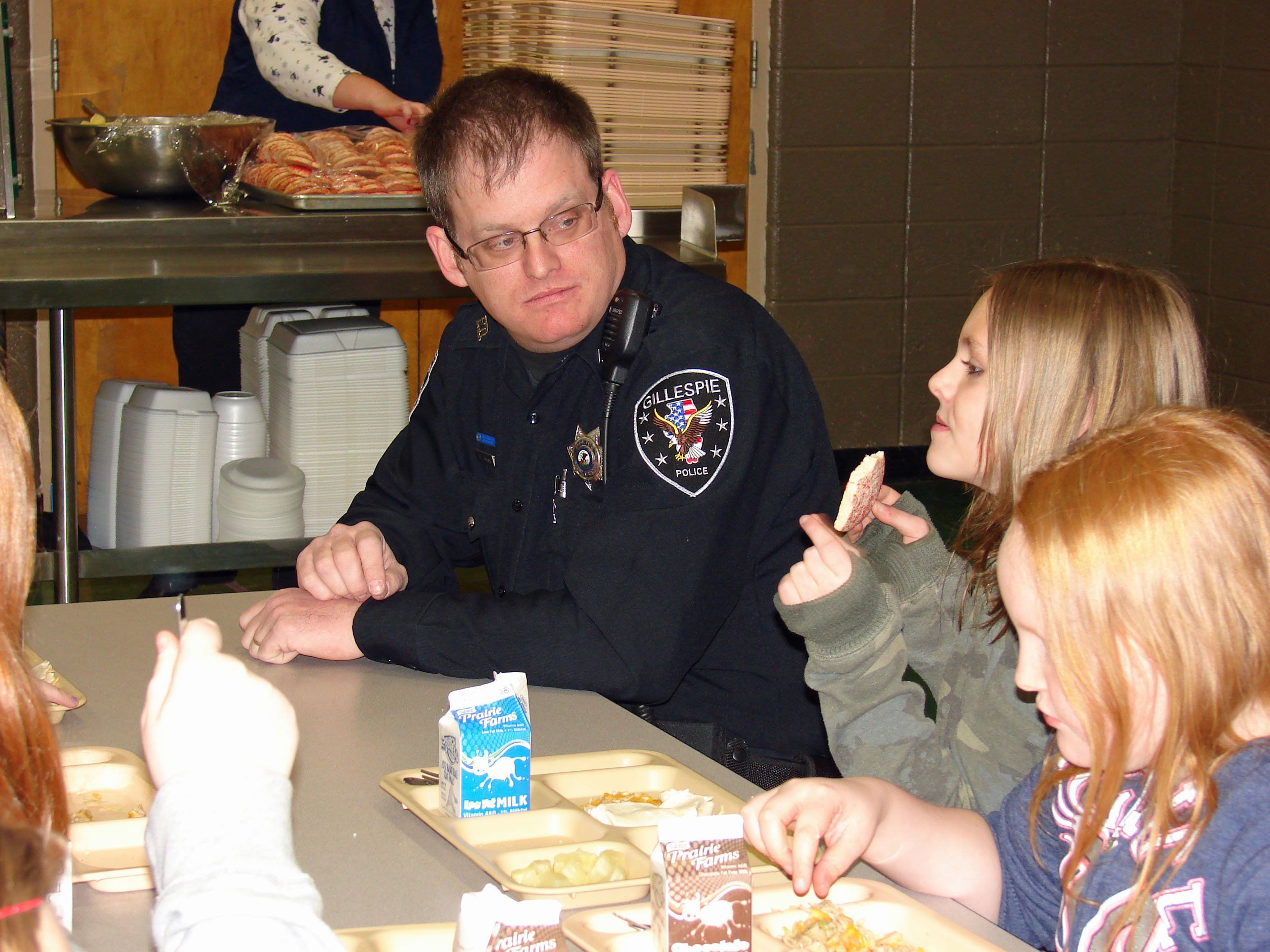 Gillespie Police Officer Jim Turney chats with a middle school student during a visit the officers paid to the middle school Monday. (By Steph Bray)