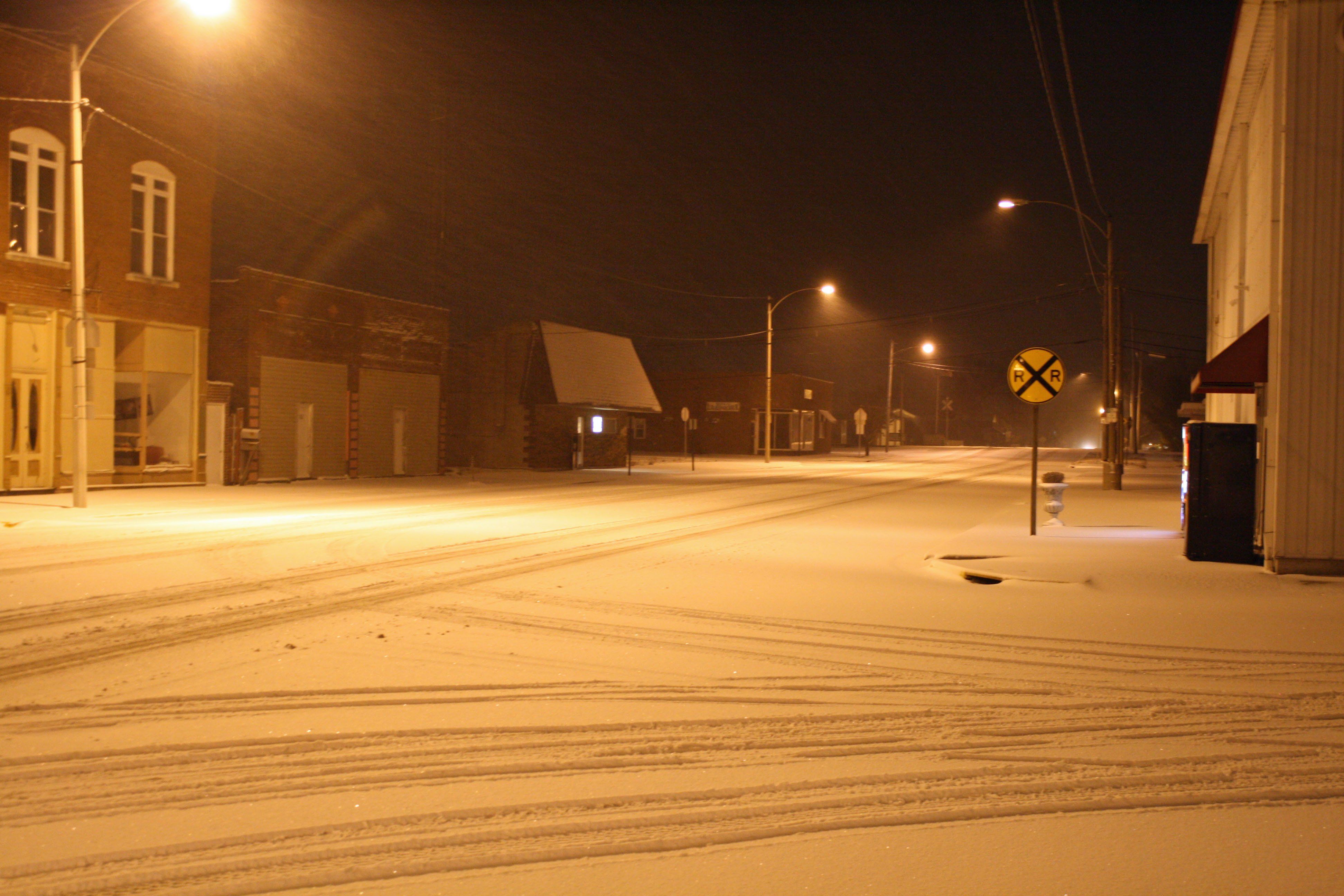 Benld Main Street gets blanketed in snow Monday evening. Most of the area received 1-2 inches.