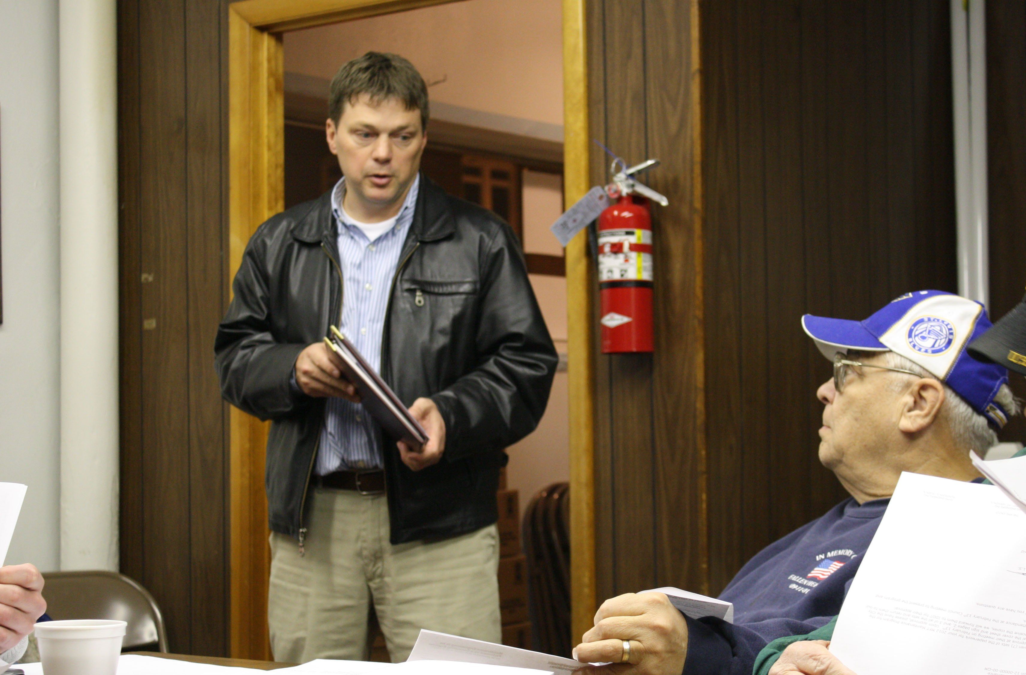 Douglas Ratermann of HMG Engineers assures Mickey during the Benld City Council meeting that the streets will not be rocked immediately before the Tour de Coal.