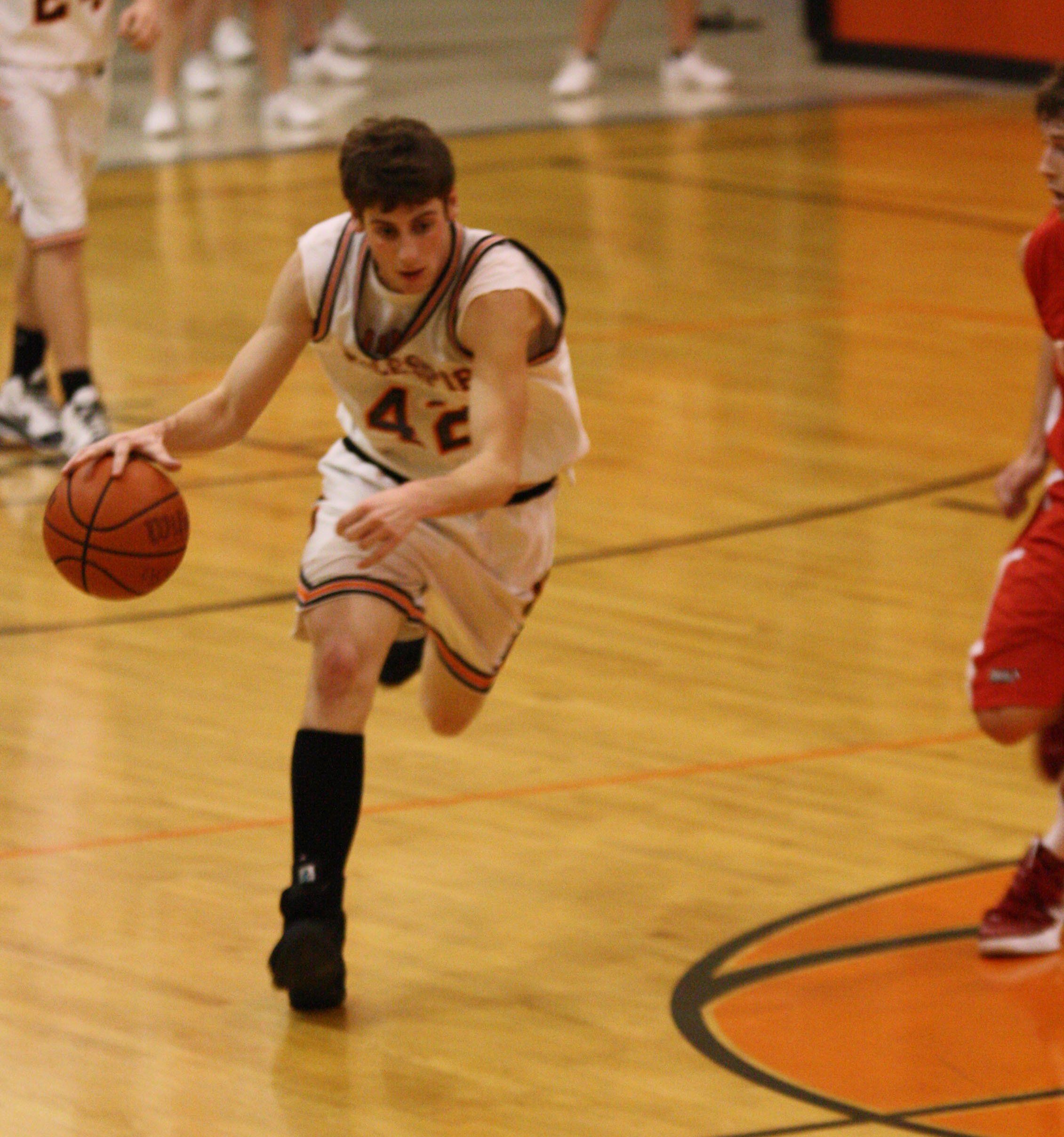 Ricky Mock dribbles down the court during his senior night Friday evening. The boys beat Staunton for their last regular season game and will play EAWR Monday in Regionals.