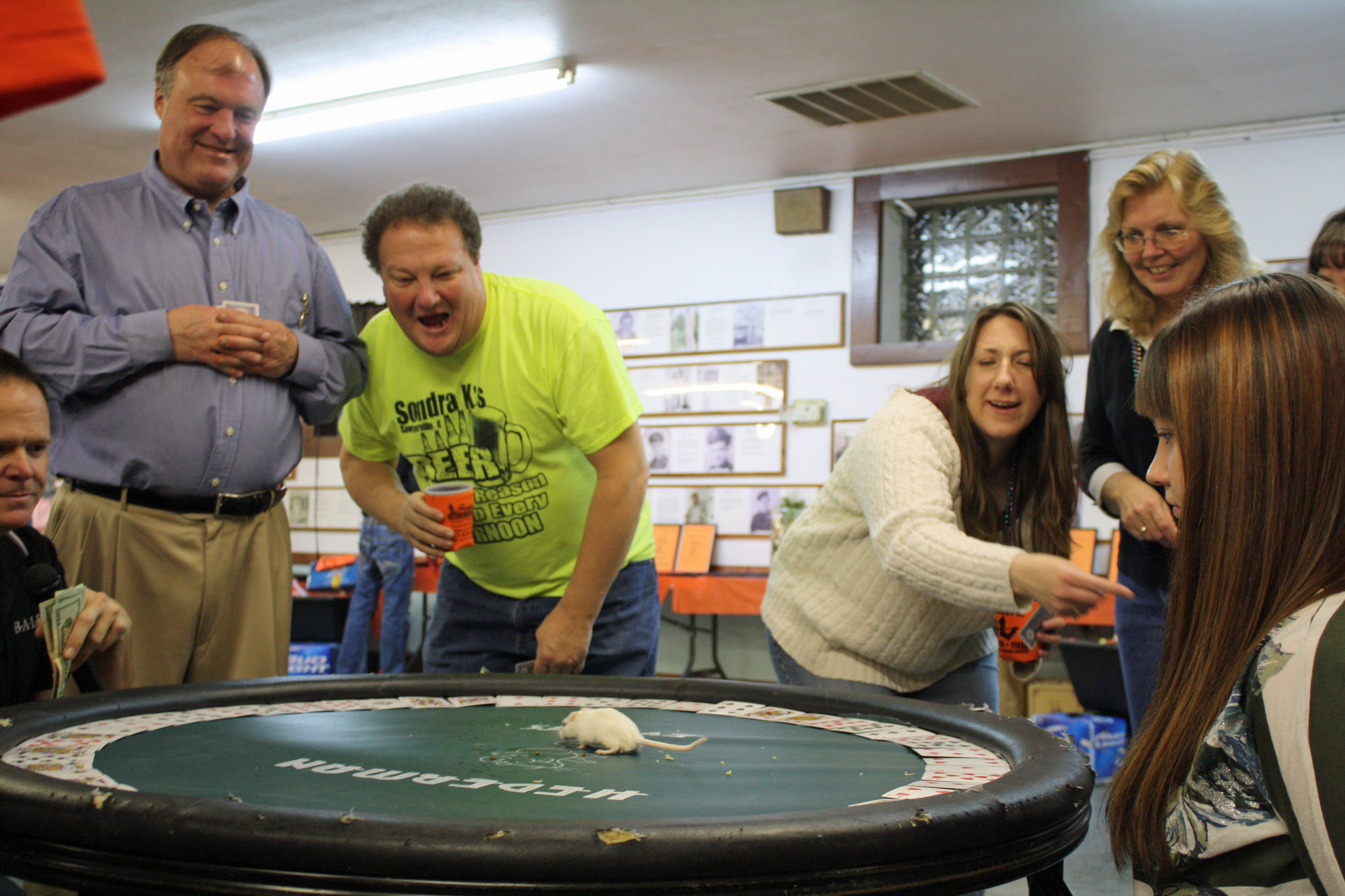 Supporters rally around the mouse roulette table to cheer for their card during the All-Weather Track Mouse Race Fundraiser Saturday evening.