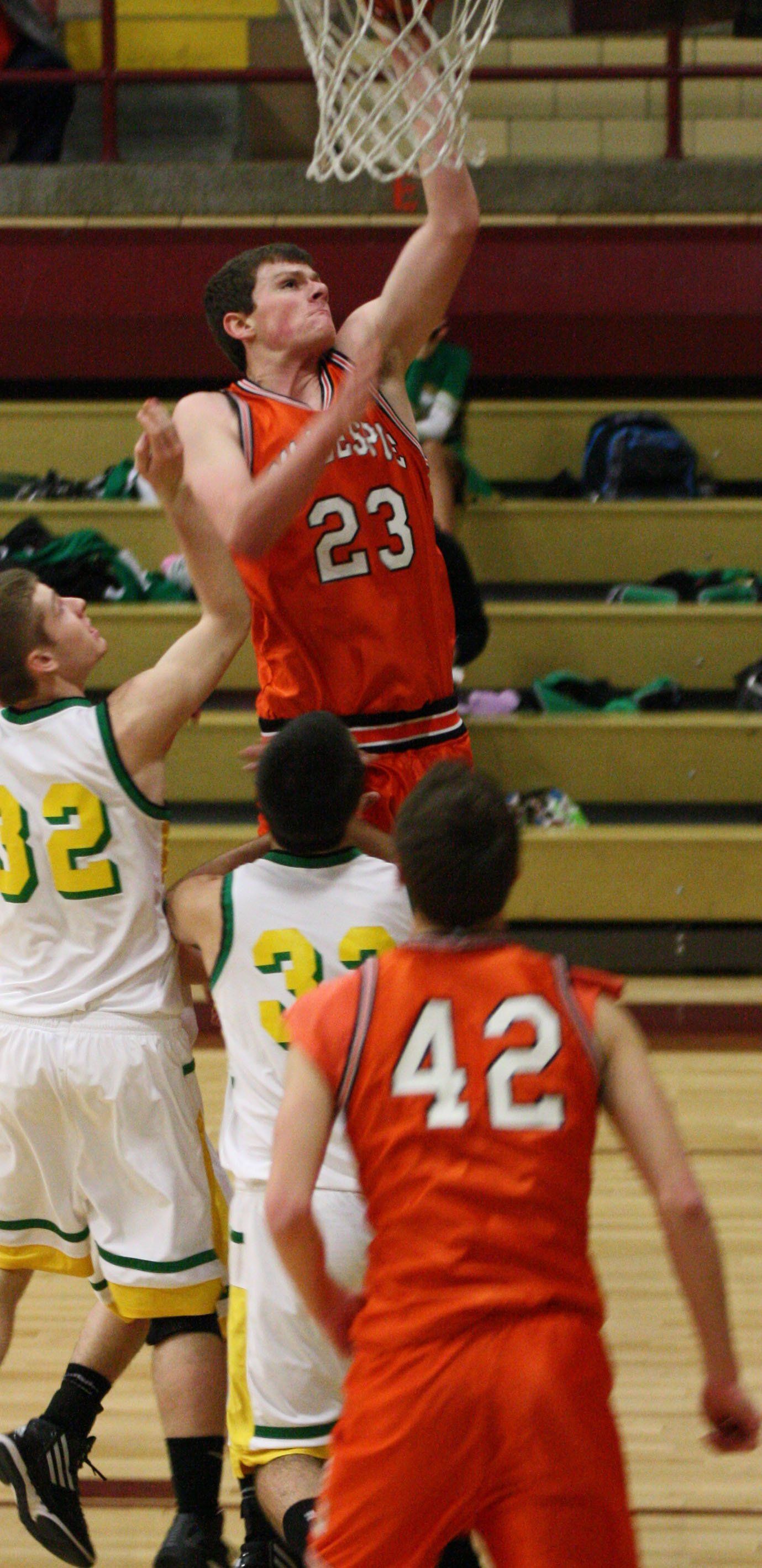 Michael Bussmann takes it to the basket during the boys last game of the season. The boys fell to Southwestern 52-47 in Regionals.