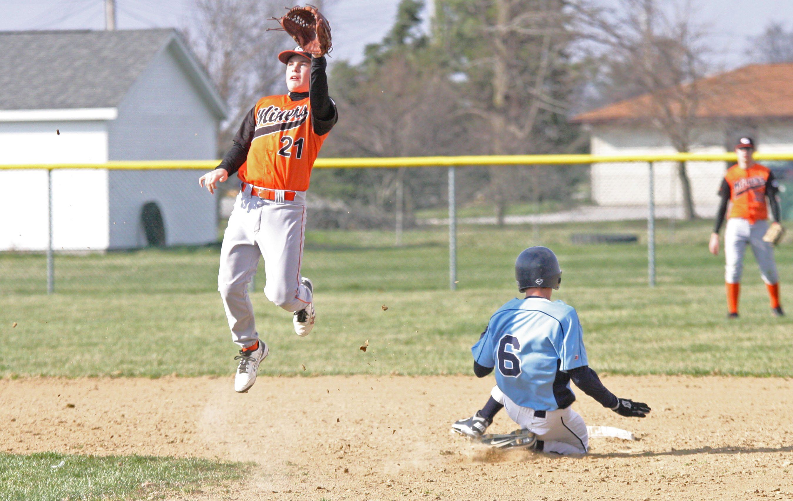 Brady Anderson jumps to catch the throw down to second base. The Miners got off to a rough start last week with a 10-0 loss to Greenville and then another 10-0 loss to Jerseyville, but then bounced back Friday with their 8-0 win over Morrisonville.