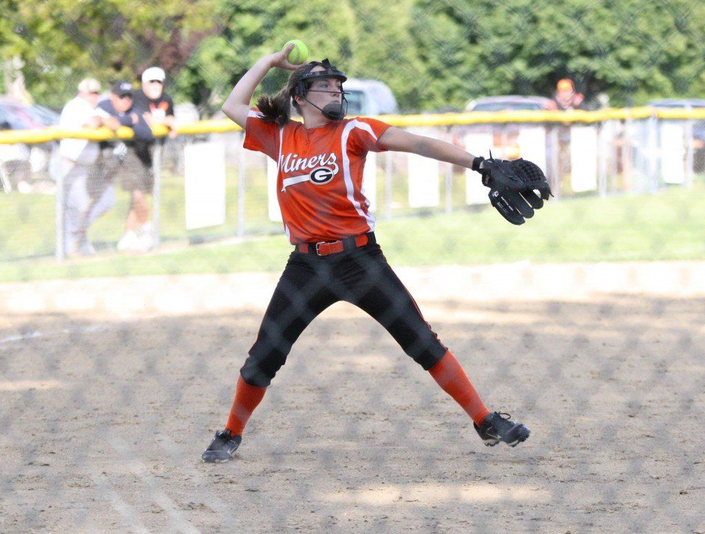 Ellen Gray throws out a girl at first base. The Lady Miners went 5-0 this week.