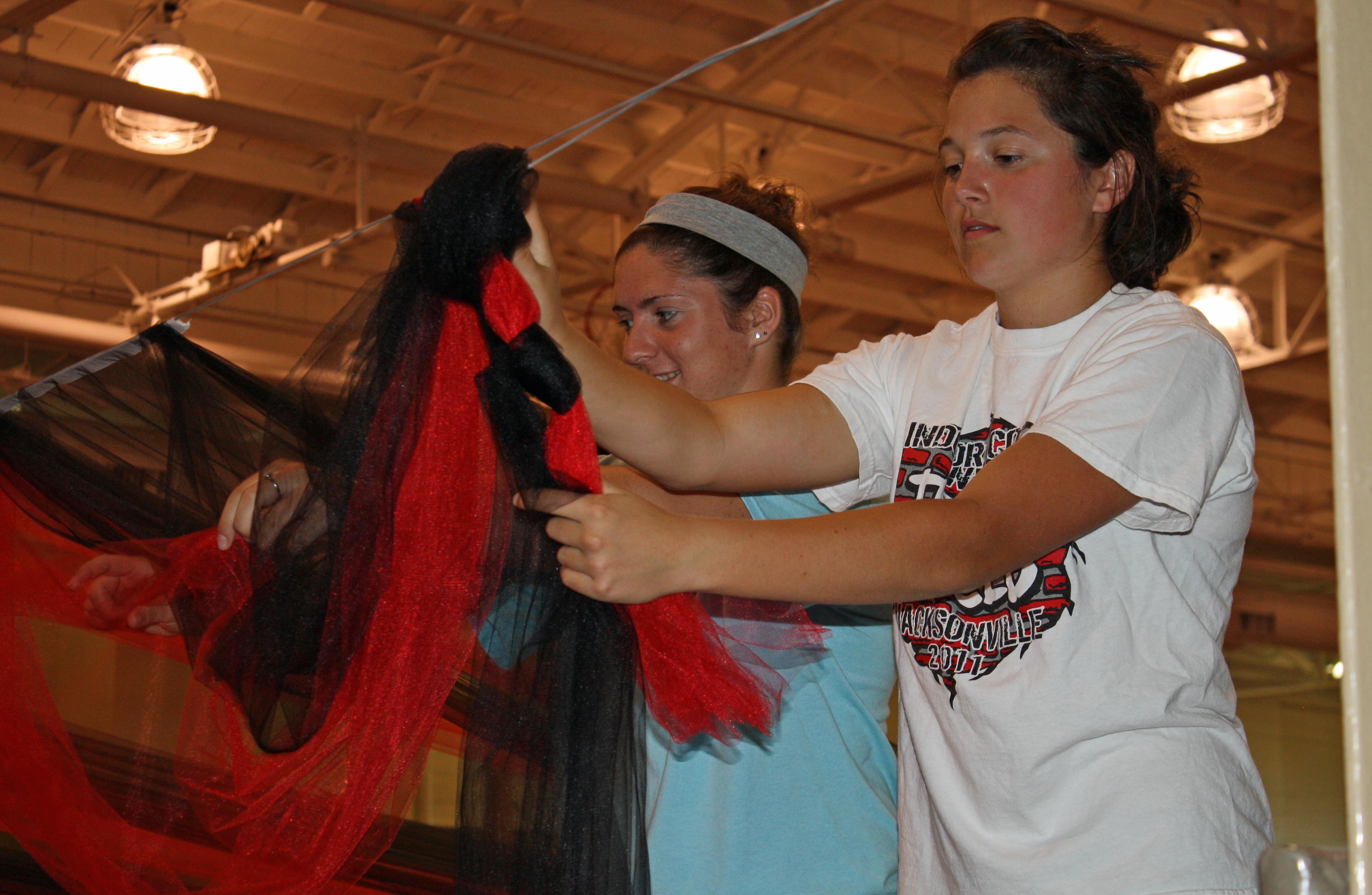 Haley Kirkwood and Allison Goldasich prepare the high school gymnasium for Saturday evening's Prom.