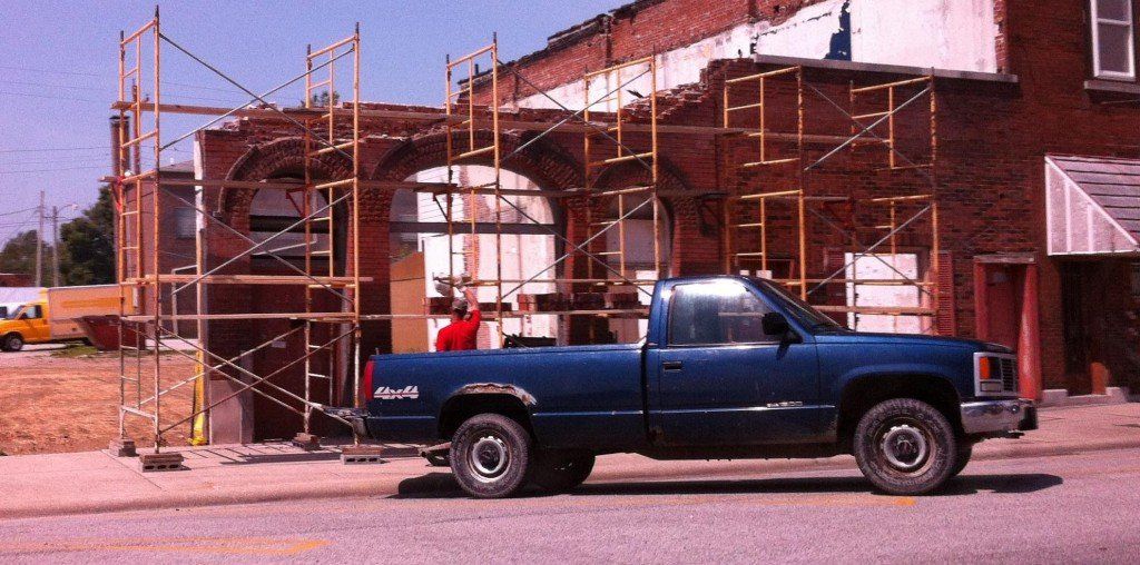 Bricklayers prepare to work on the buildings on Macoupin Street.