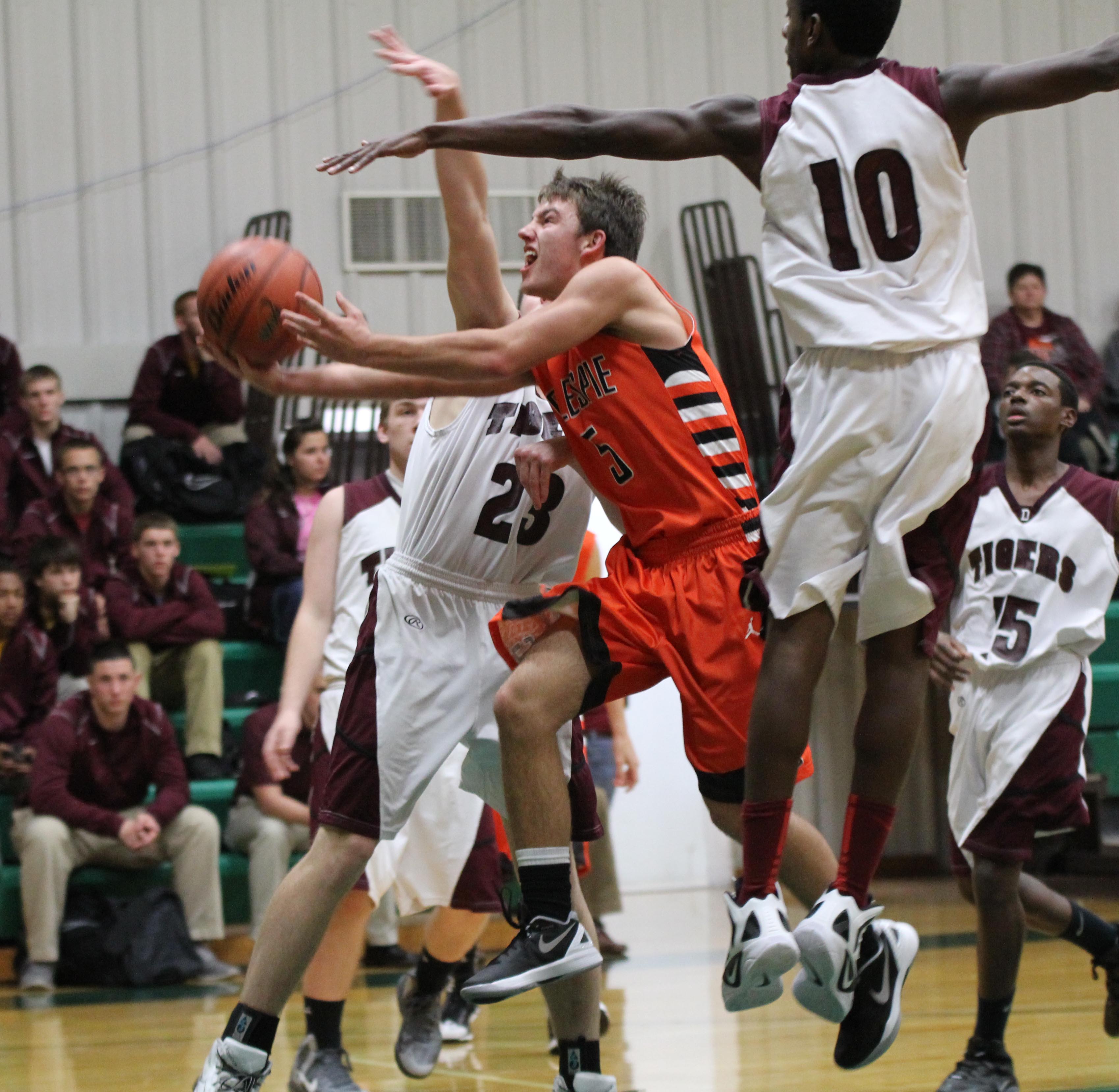 Blake Peterson travels through two defenders and lays the ball in the basket in Gillespie’s win over Dupo. The Miners took sixth place in the Metro Thanksgiving Tournament last night.