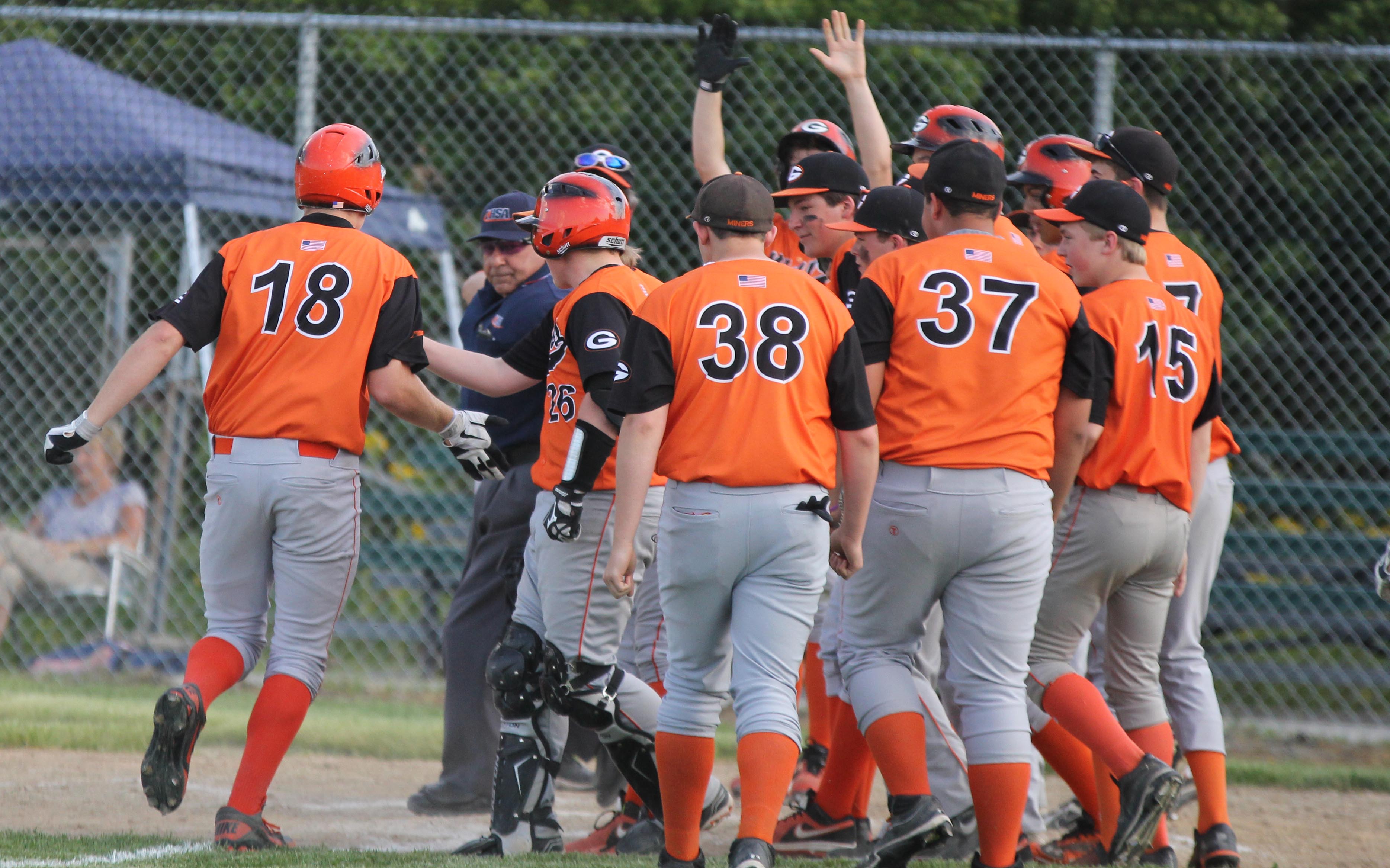 The baseball team gathers around home as they welcome Joe Janssen in after Joe hit a 3-run homerun in the regional semi final game.