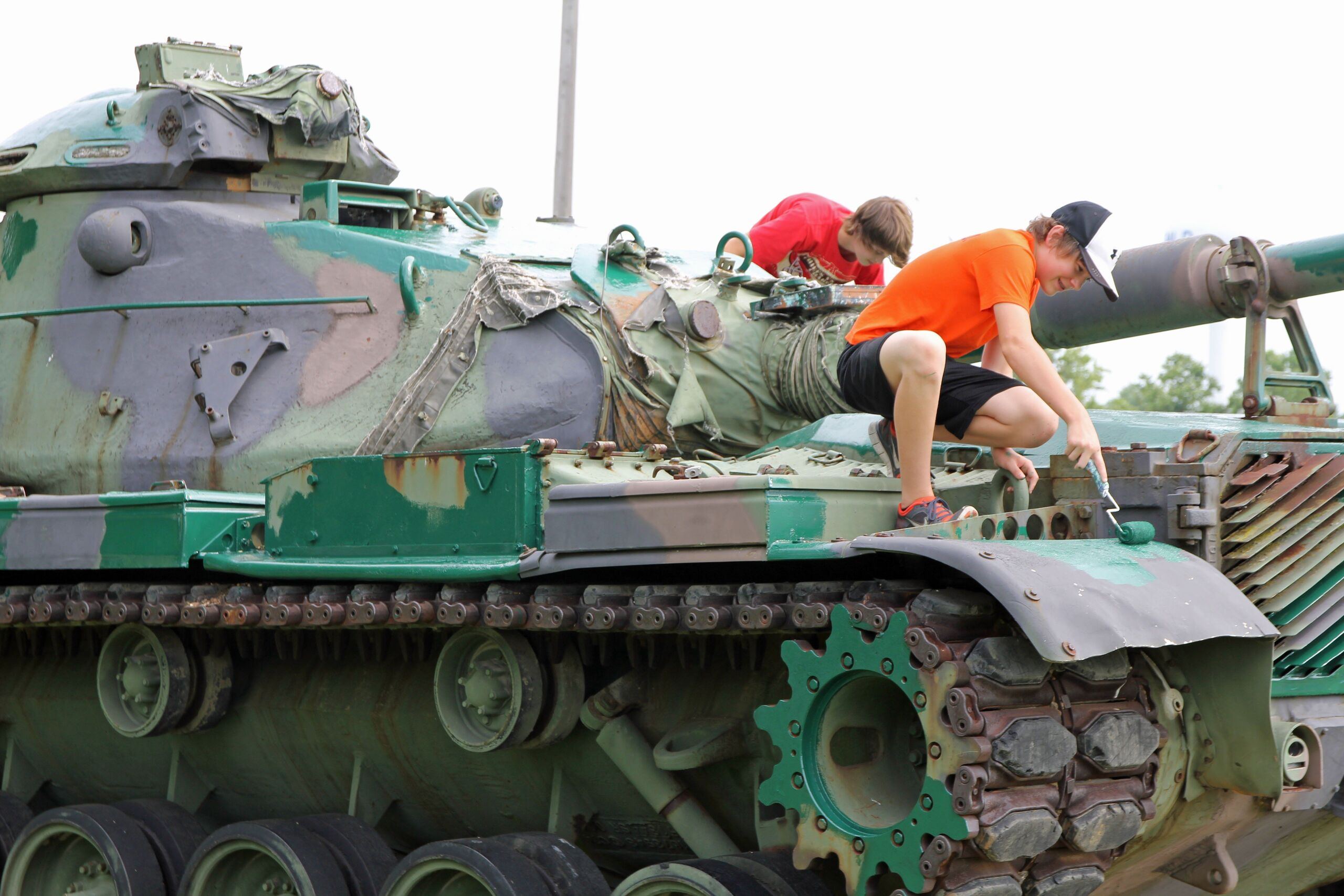 Volunteers help Build Benld put a fresh coat of paint on the tank in Benld. Volunteers also painted bleachers at the city ball field and painted tractor tires to be placed in the ground at the playground.