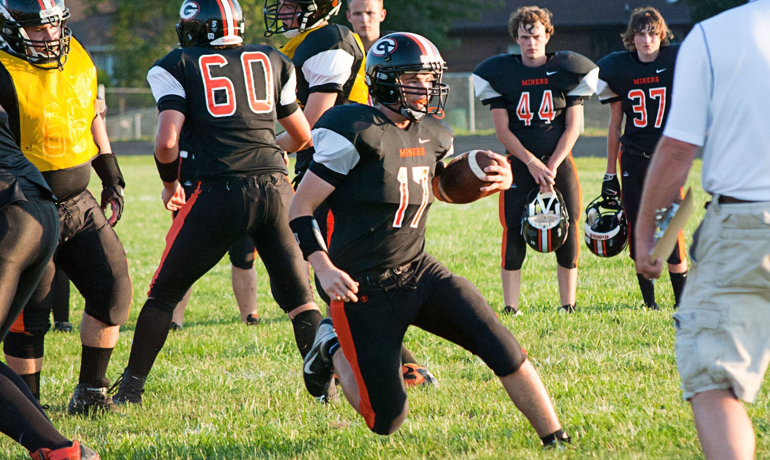To kick off the football season, the Miners held a scrimmage against their own team. Above, Michael Henderson carries the ball up the middle looking for room to run.