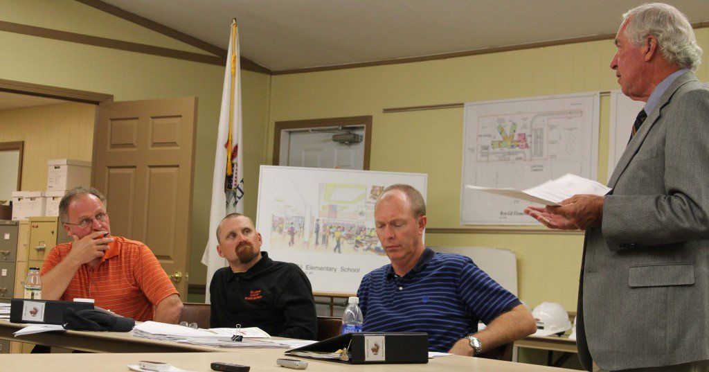 Board Members David Griffel, Bill Carter, and Weye Schmidt listen as Tom Hyde (far right) explains progress on the Ben-Gil Elementary School.